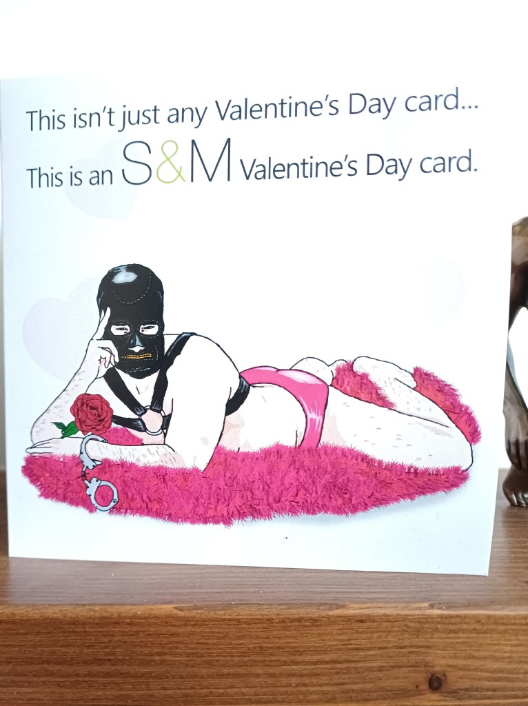 He then announced that the parcel on the table was a valentine’s present for me! So I went and got the presents I’d got for him and he gave me his card and another present – beautiful and well thought of gifts from him, and a card that made me laugh out loud. My gifts to him were largely traditional (sexy undies and chocolates).
