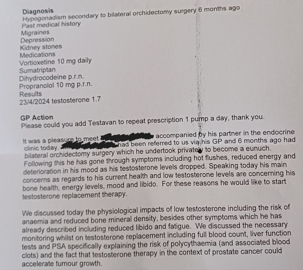 The rest of the morning I did some work on the wiki writing an article on how to get testosterone out of the NHS, the effects of testosterone withdrawal, and supplements that help with testosterone withdrawal. When I start hormone treatment, I also have two articles which I’ll release when I start treatment: “castrated orgasms” and “preventing erectile dysfunction”. Until I start testosterone, I can’t be certain if what’s going to change!