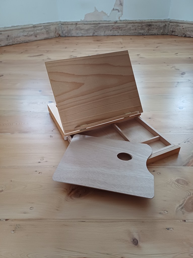 In one of the shops I found this little artists case with a built in easel and a little drawer with a pallet and sections for brushes and paints. It was unused.