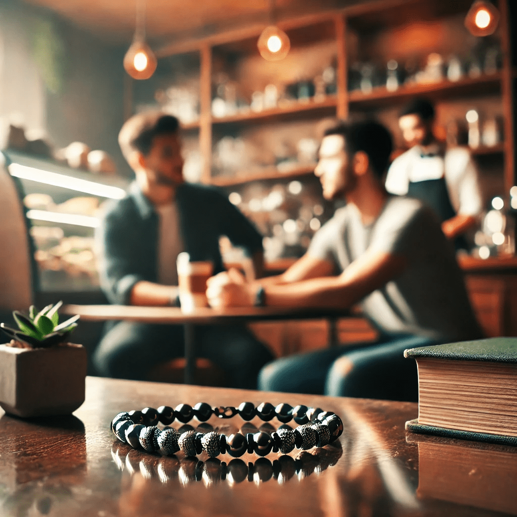 While we’re talking, I’m playing with a haematite bracelet I bought from a shop that sells crystals and tarot cards and candles and such like.