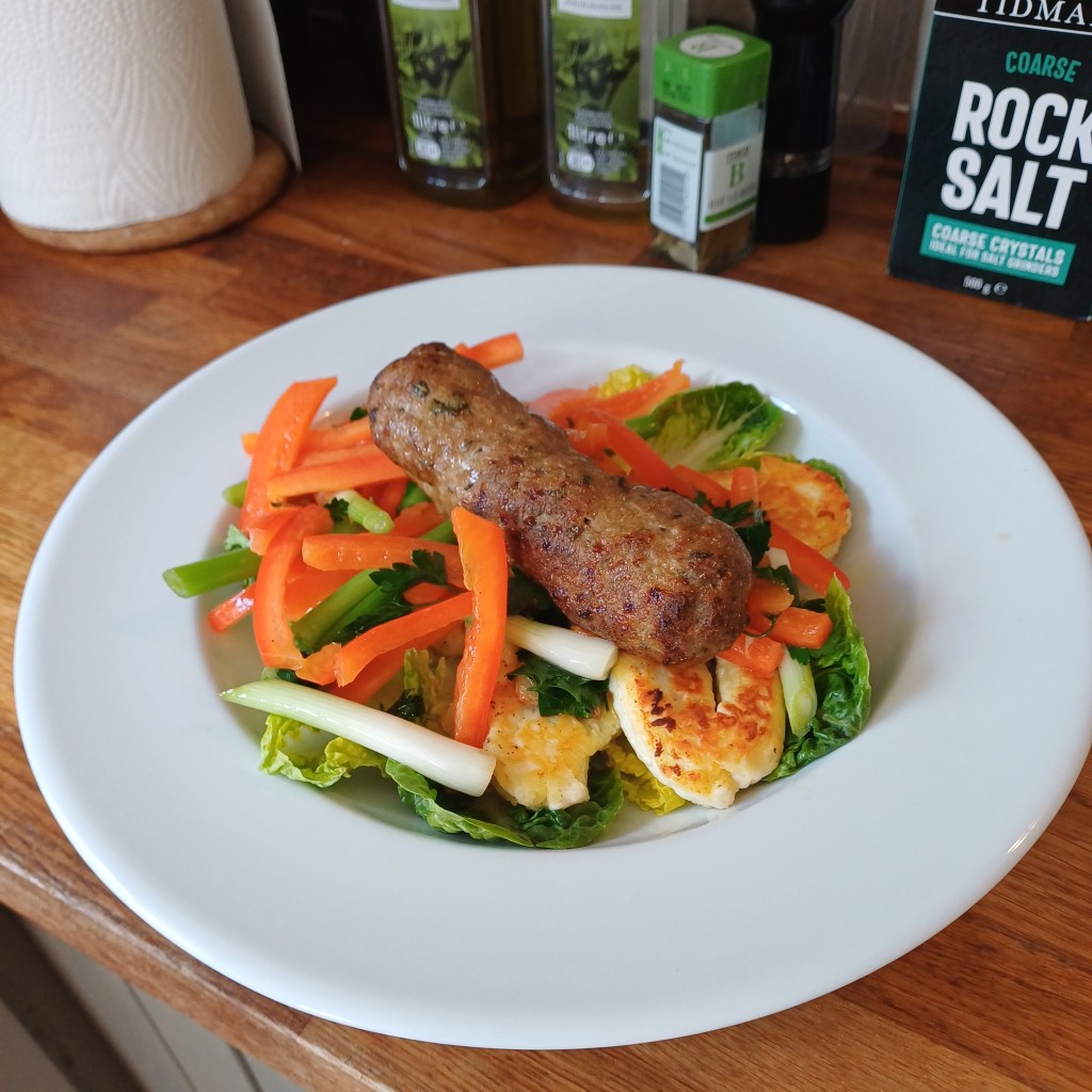Today’s was lamb kofta on lettuce with sautéed garlic and al dente vegetables.